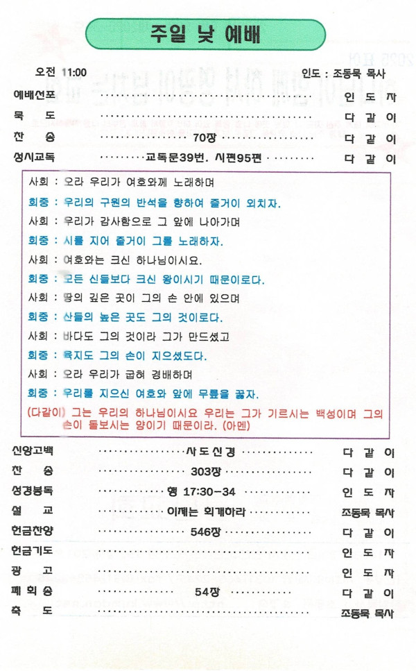 2025-09-28 주일 예배순서입니다 페이지 정보 작성자 최고관리자 작성일25-10-22 17:35 조회38회 댓글0건 관련링크 이전글 다음글 목록 본문 2025-09-28 주일 예배순서입니다 댓글목록 등록된 댓글이 없습니다. 이전글 다음글 목록