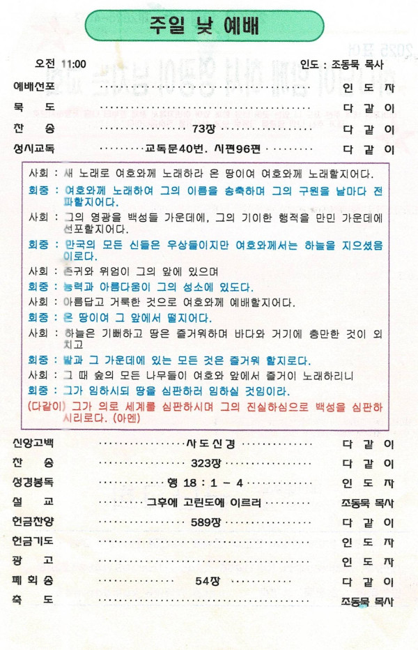 2025-10-05 주일 예배순서입니다 페이지 정보 작성자 최고관리자 작성일25-10-22 17:35 조회50회 댓글0건 관련링크 이전글 다음글 목록 본문 2025-10-05 주일 예배순서입니다 댓글목록 등록된 댓글이 없습니다. 이전글 다음글 목록