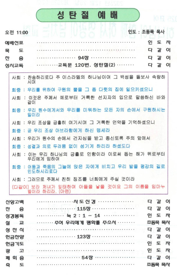 2025-12-25 성탄절 예배순서입니다 페이지 정보 작성자 최고관리자 작성일26-01-29 12:13 조회84회 댓글0건 관련링크 이전글 다음글 목록 본문 2025-12-25 성탄절 예배순서입니다 댓글목록 등록된 댓글이 없습니다. 이전글 다음글 목록